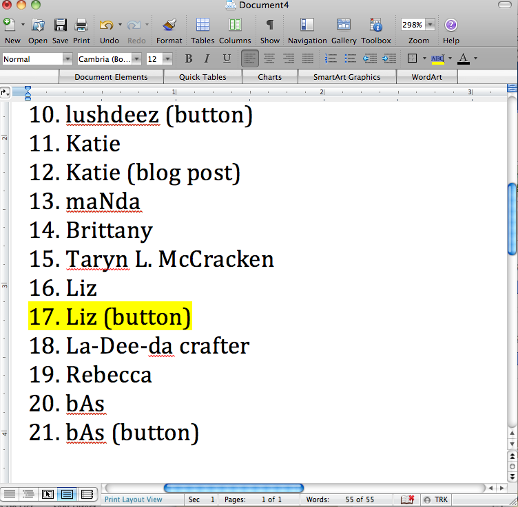 Number 17 was Liz of Torts, Teeth, and a Tootsie Roll. Congratulations, Liz! Please email me your shipping info at lifewithelizabethblog[at]gmail[dot]com.