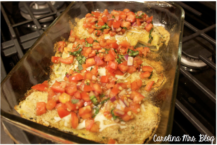 10. Top chicken with bruschetta and return to oven for five minutes so that the bruschetta will be warmed.