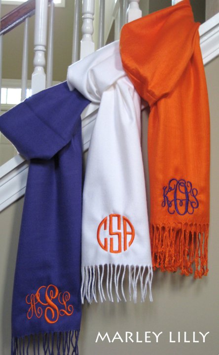 Marley Lilly monogrammed pashmina. I have one of these (with my new monogram!) and I love it. I’ve been wearing it all the time because its so cute.