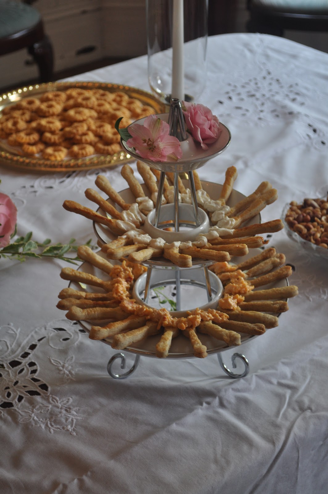 These are cracker spoons with pimento cheese and a pineapple spread. My cousin made the cracker dough and cut and baked every single spoon.