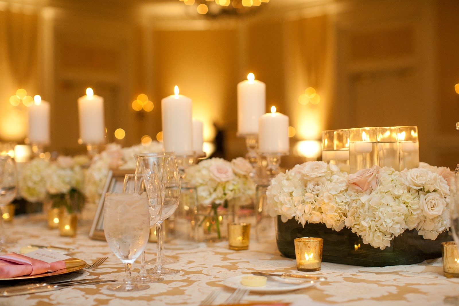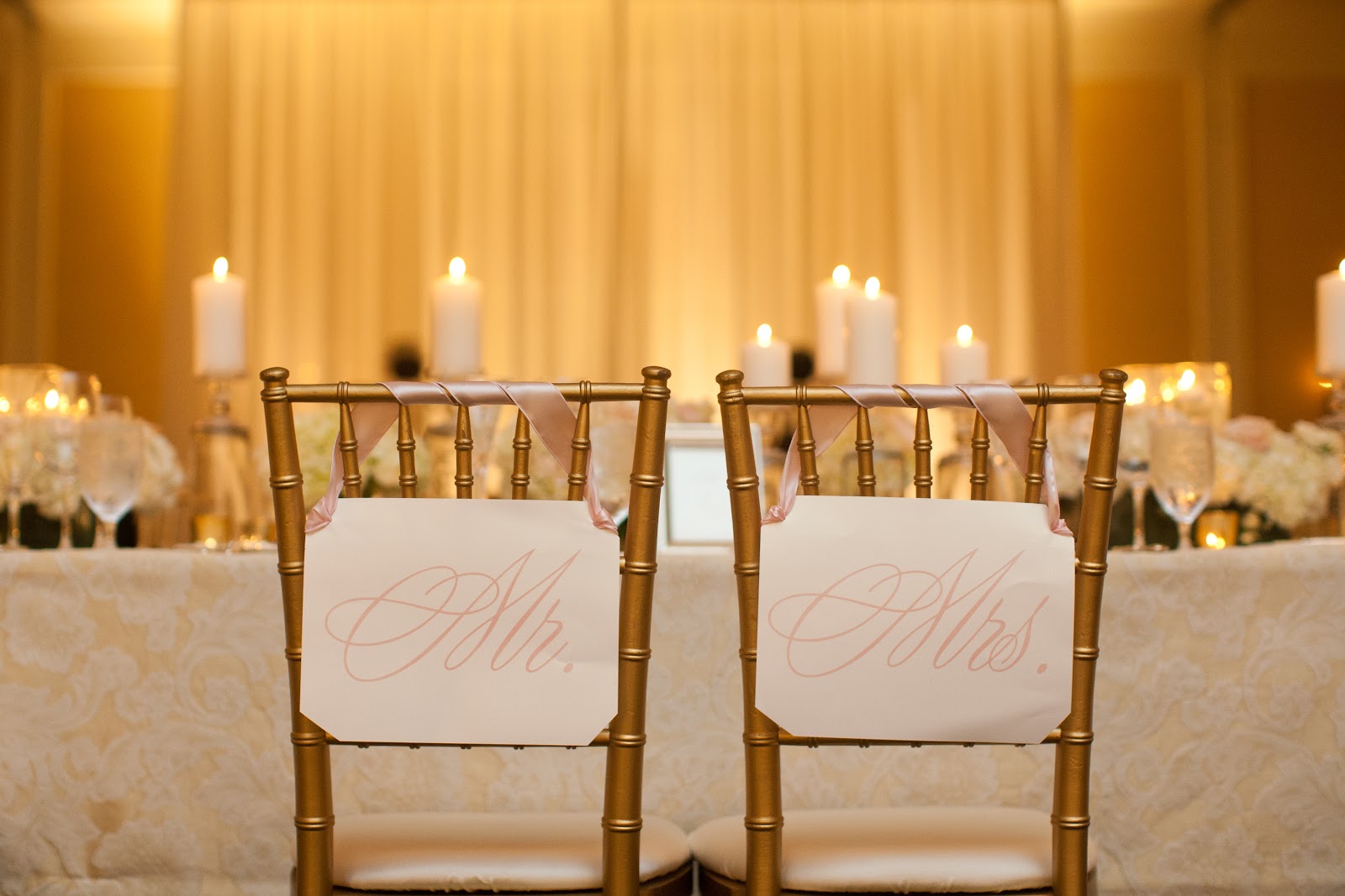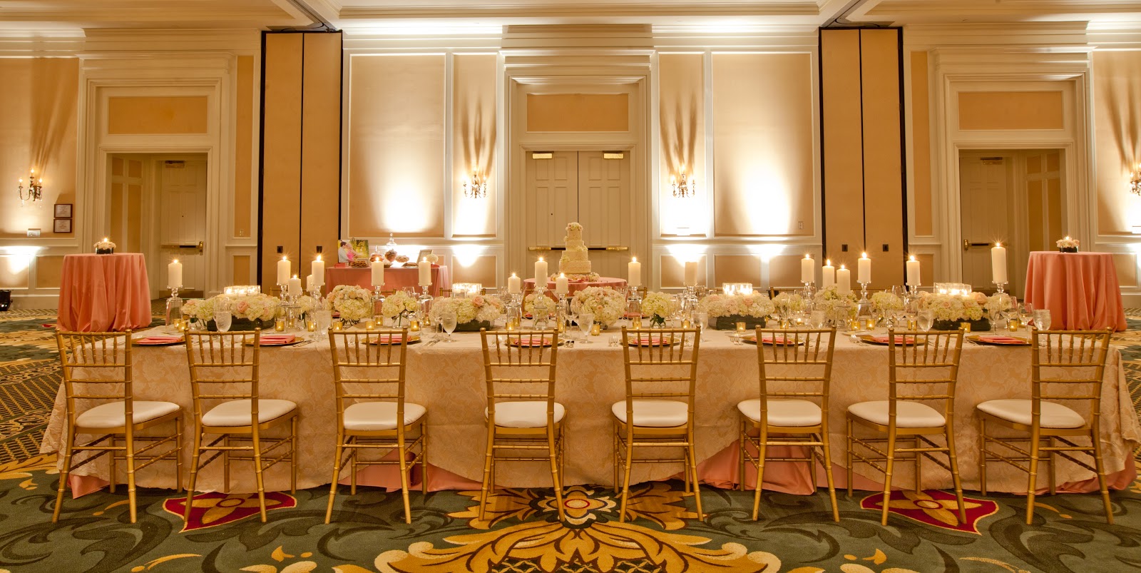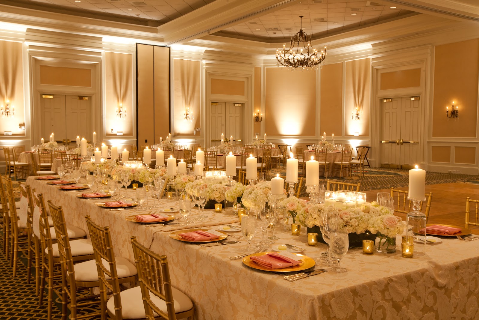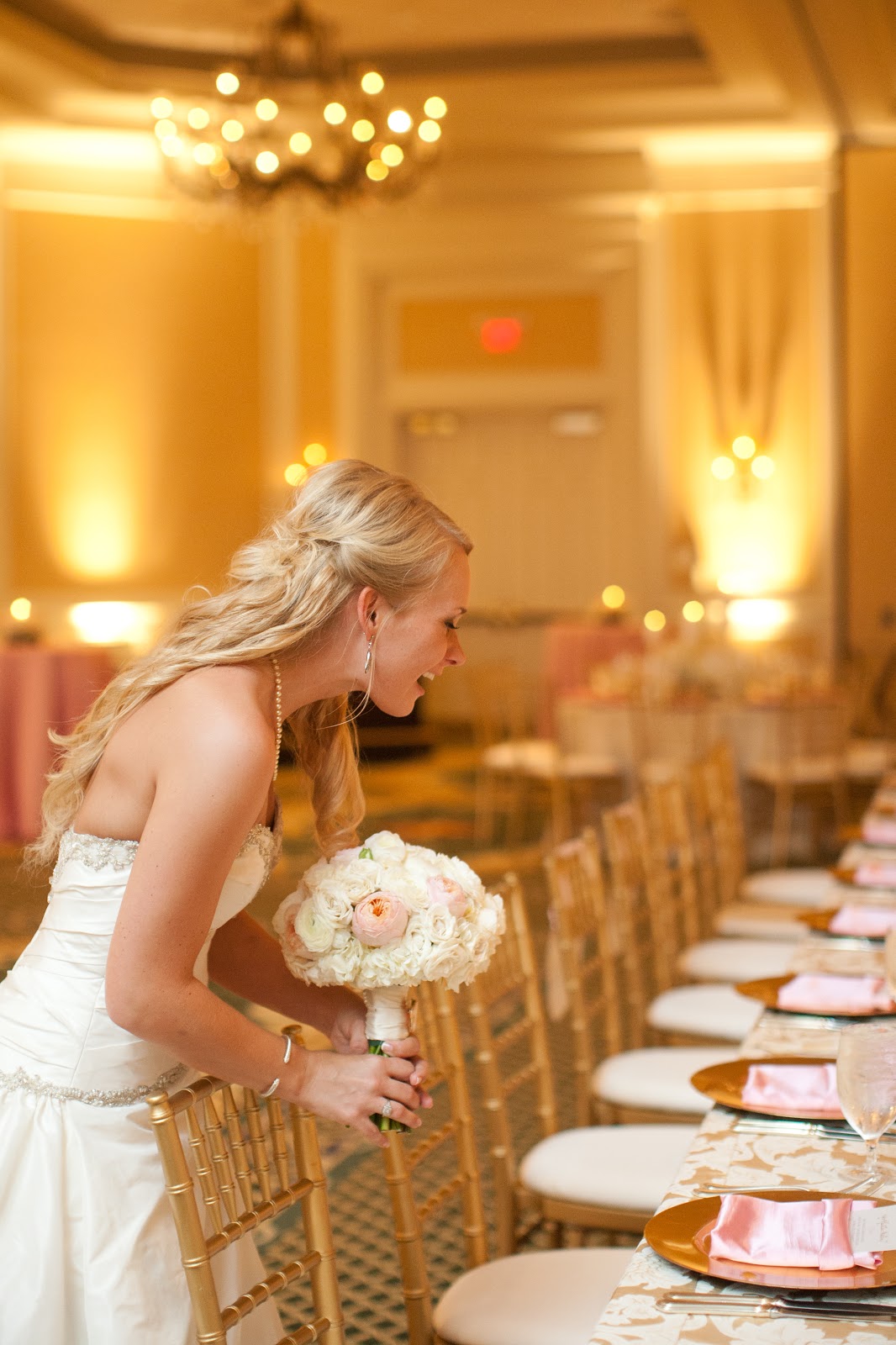 Hi lovelies! Today, I wanted to continue on with the Hitched series and share some photos of our reception decor. I have to say our reception turned out beautifully and just the way I dreamed. This is thanks to Cortenay of Carolina Wedding Design. Brides to be in the Charlotte area – HIRE HER! Not only will she turn your best ideas into a reality, but if something goes wrong you won’t even know about it. Our reception was held in the ballroom at Ballantyne Resort in Charlotte. My colors were blush pink and gold and we were going for a “swanky, Southern, sophisticated” feel.