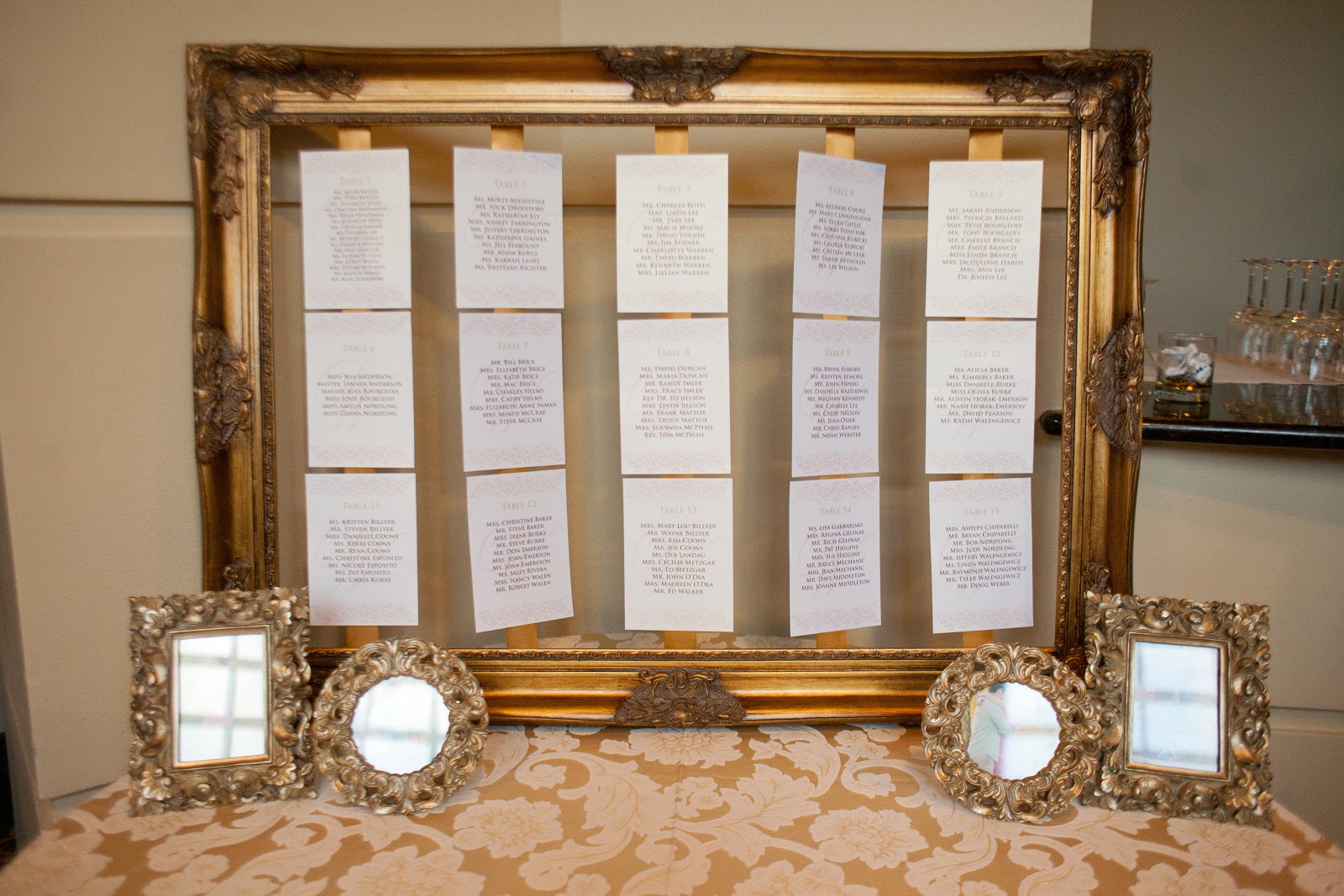 This is our seating chart. The gorgeous gold frame was borrowed from Cortenay.