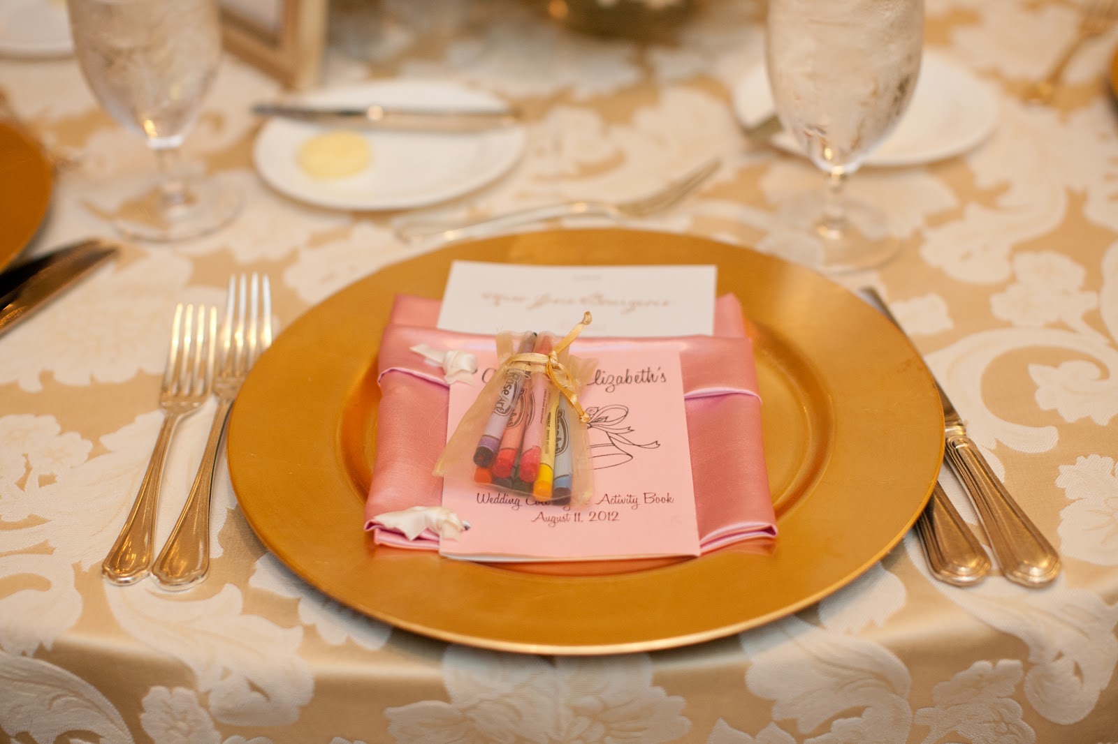 I made coloring books for the kids’ table and added a little gold baggie of crayons.