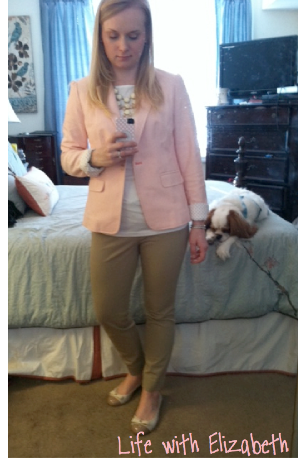 Blazer: Loft  Tee: Lilly Pulitzer lanette Pants: Banana Republic  Flats: Cole Haan (with the Nike air soles – so comfy!)  Bubble necklace: Townhouse boutique