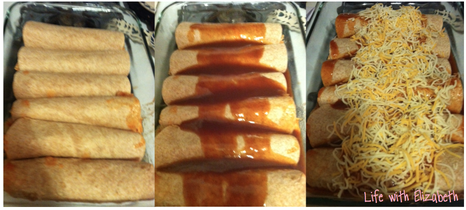 Top with sauce. You probably will not use the entire can. Just use as much as needed so that the enchiladas are covered with a little sauce dripping down to the bottom. Then, top with cheese.
