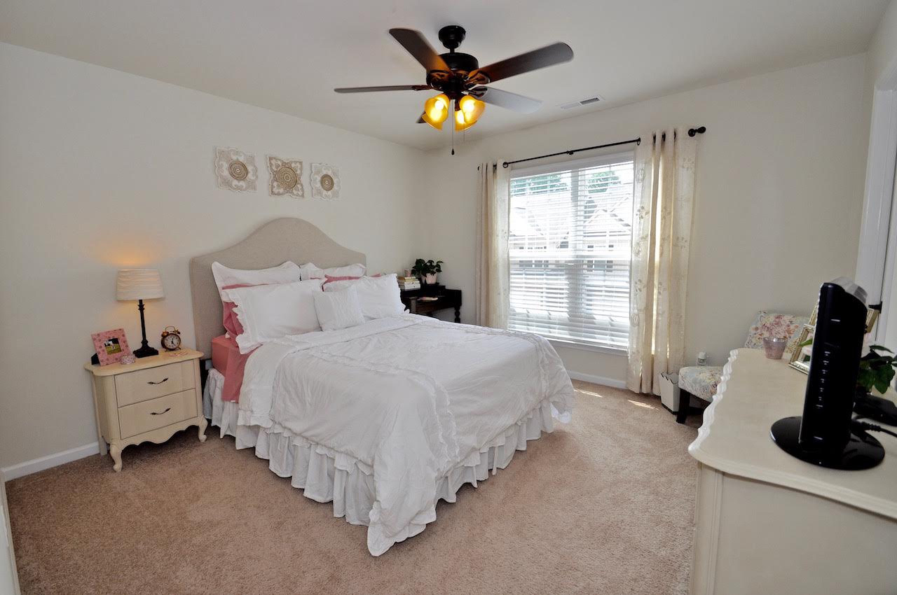 When we moved at the beginning of the summer, we moved from a three bedroom home to a four bedroom home. We have a guest room currently and it is set up almost exactly as it was in our previous home, except for the pretty patterned chair doesn’t fit with the layout so it got bumped to our bedroom, which I’m not hating. I also had to replace those curtains since the new room has two sets of single windows instead of one double and added a couple more throw pillows.