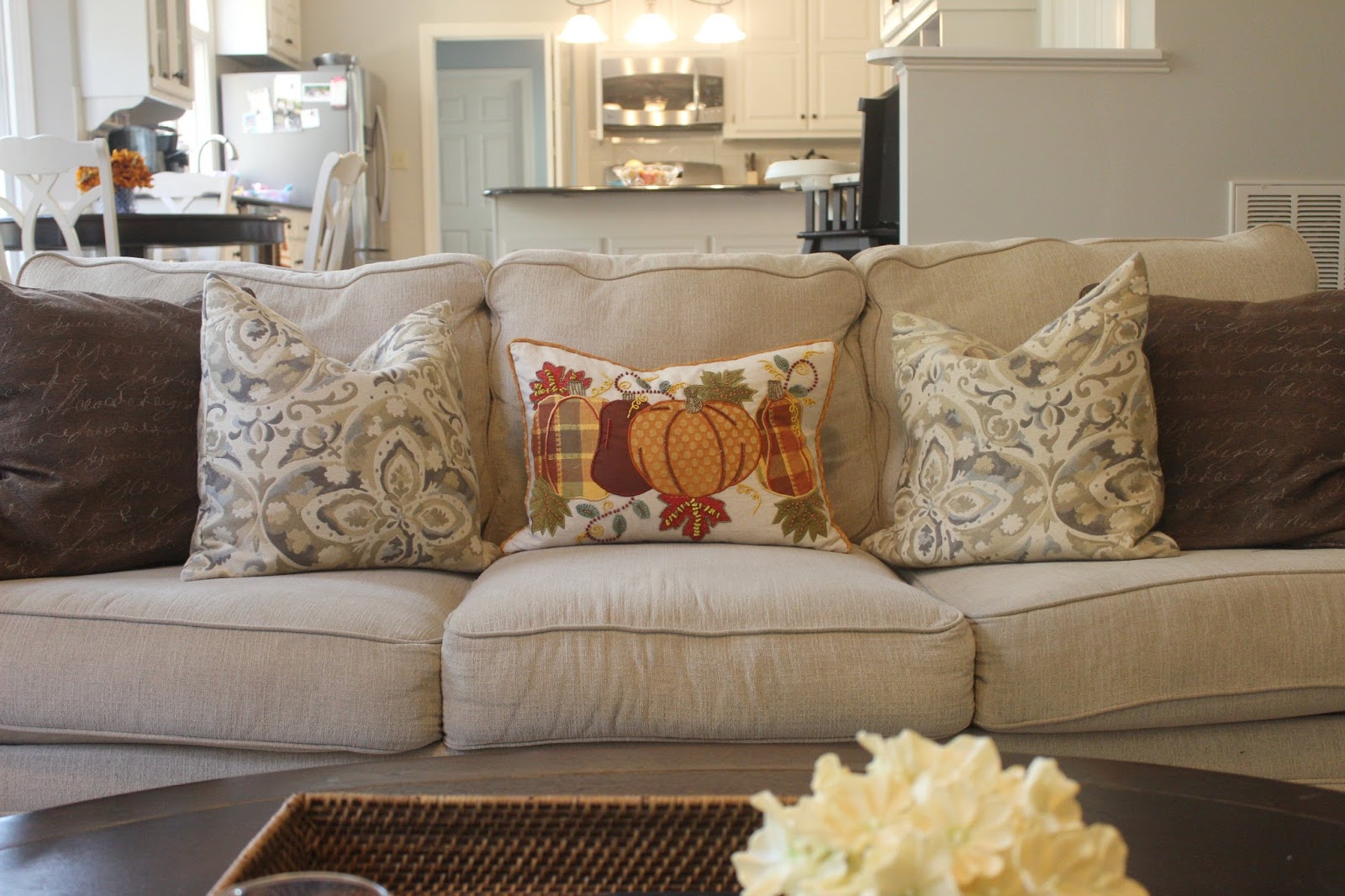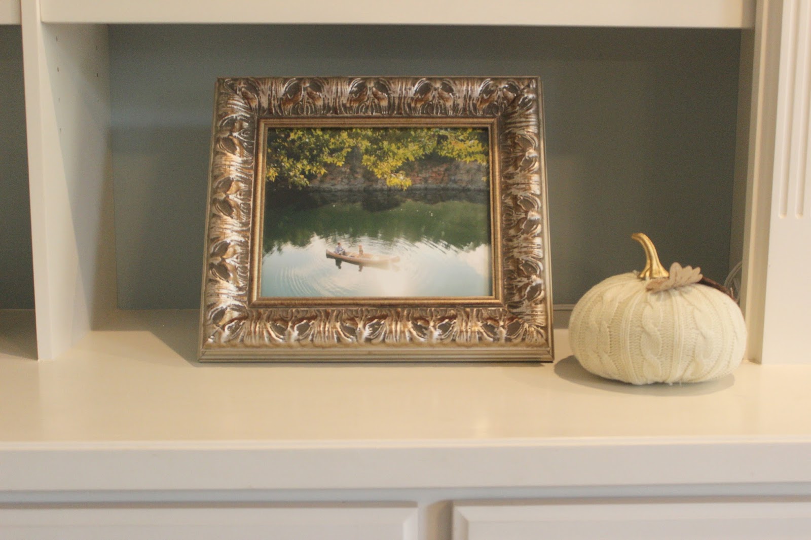 In our living room, I added a few white pumpkins to our built ins and mantle and a fall throw pillow I picked up at Home Goods. Next year, I would like to add some kind of garland to the mantle. I love the white pumpkins in this room, though, because it adds that touch of fall without detracting from the color scheme I chose for this room.