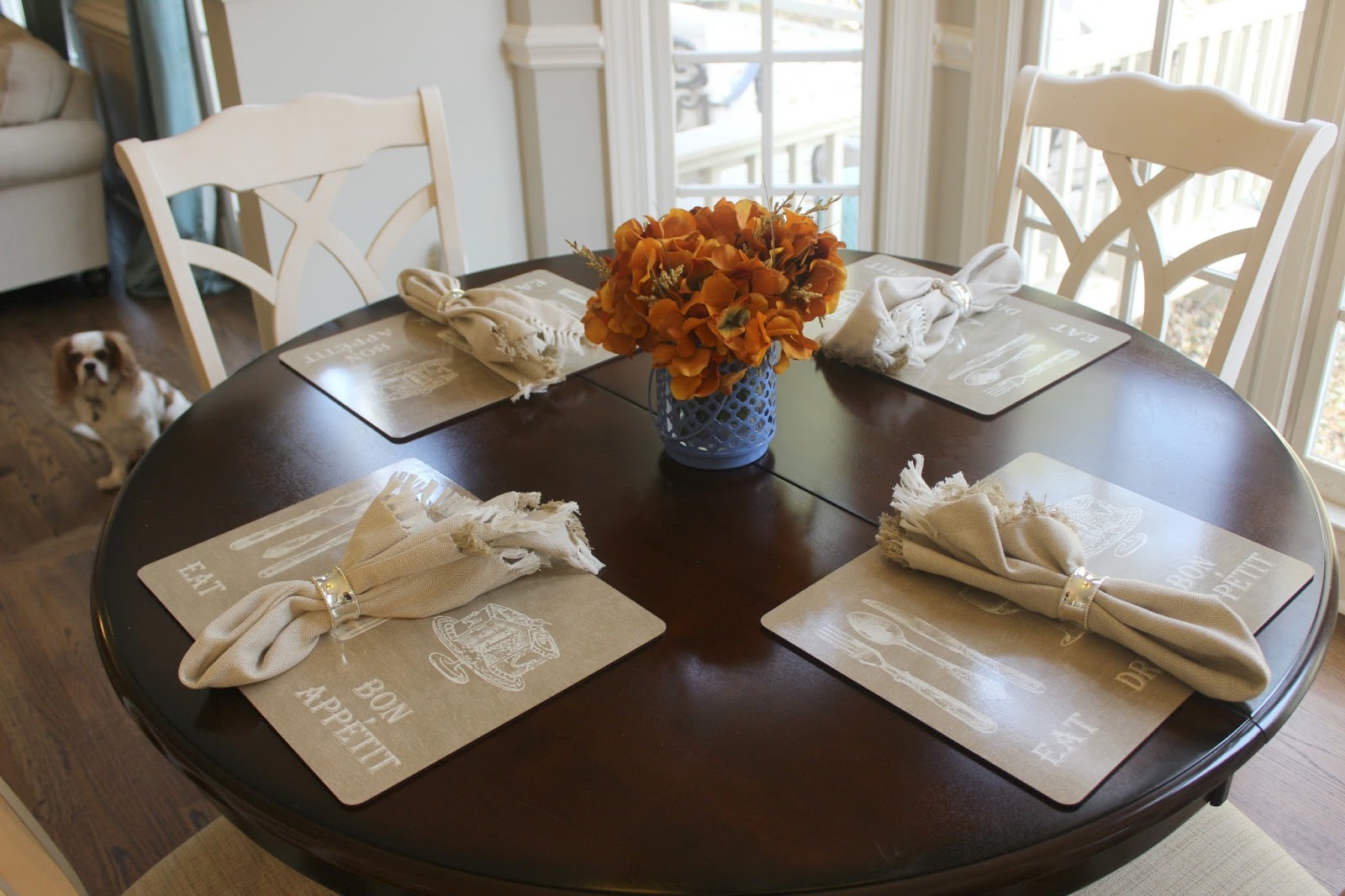 I just added some fall flowers to the table in our breakfast nook. This is where we eat most of our meals so I don’t do anything really fancy in here. I picked up these cork placemats from HomeGoods and I am obsessed with them. It took some getting used to because I prefer cloth but just being able to wipe them off is a game changer for every day meals.