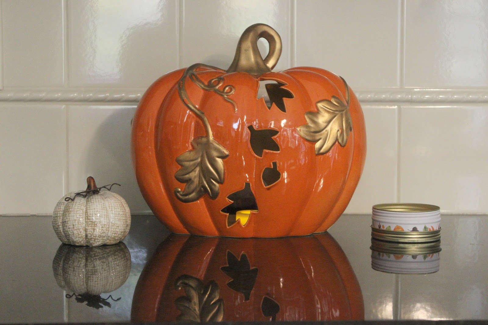I have this pumpkin, purchased years and years ago, on our kitchen counter with a smaller pumpkin and fall candle beside it. We have lots of counter space in our kitchen so there is one long stretch that typically has nothing on it. I think it will be fun to play with this space during the holidays. Plus, I will always need a little something to detract from that backsplash that I hate!