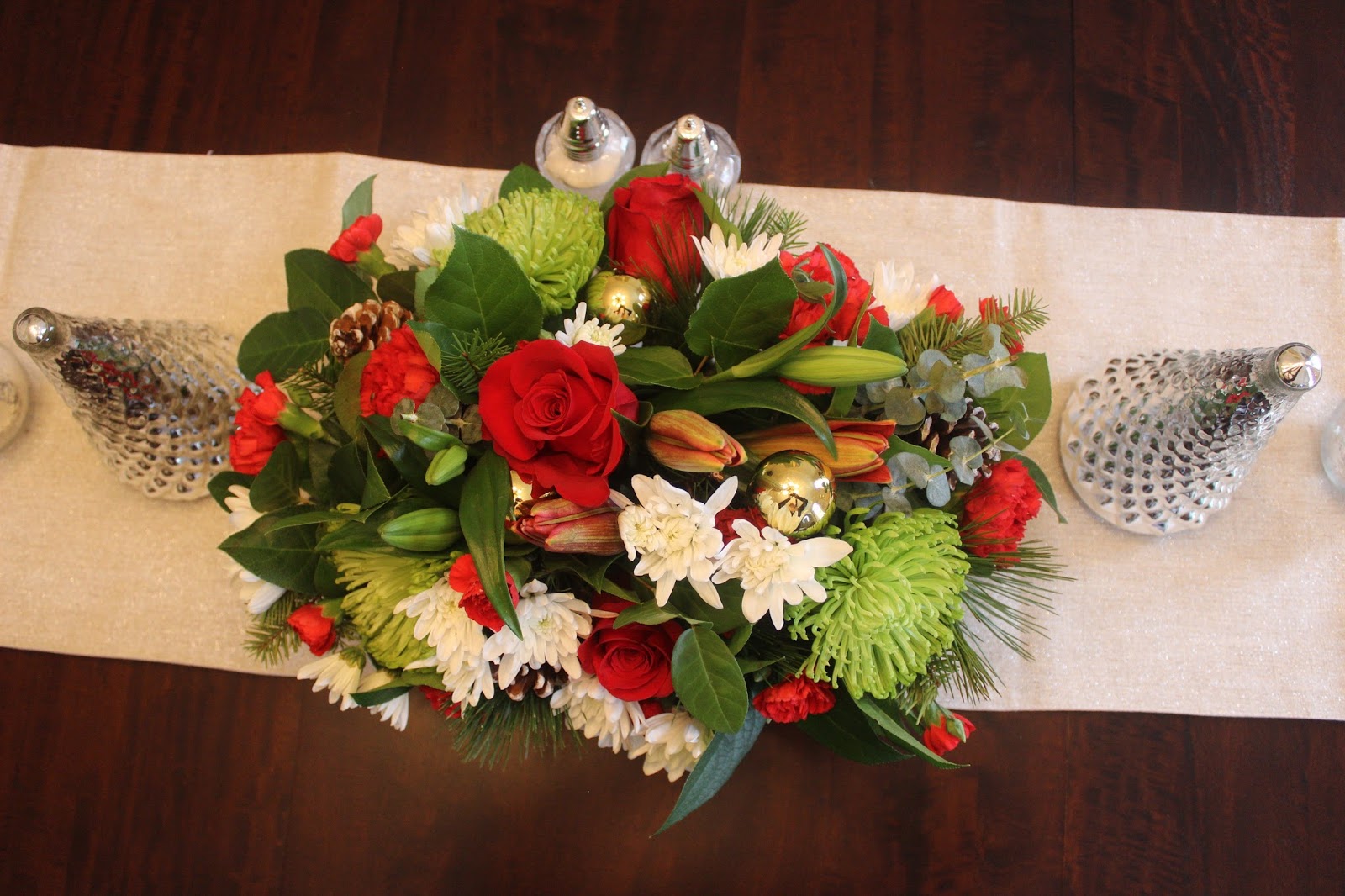 For the dining room, I added a holiday table runner, two crystal trees from Target, and this beautiful floral arrangement that Corey brought home for me. Isn’t it gorgeous?