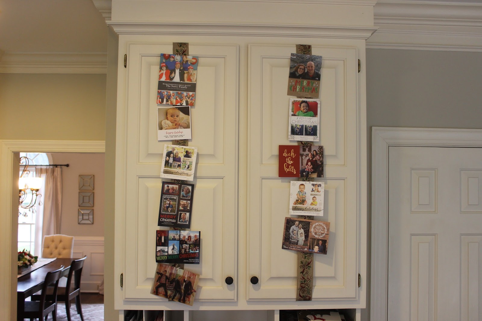 I am displaying our Christmas cards on the cabinets in our little breakfast-nook desk area. This was so easy. Just attach the ribbon to the cabinets (I used picture hanging command strips so I can put it back easily next year) and hot glue tiny little clothes pins for the cards.