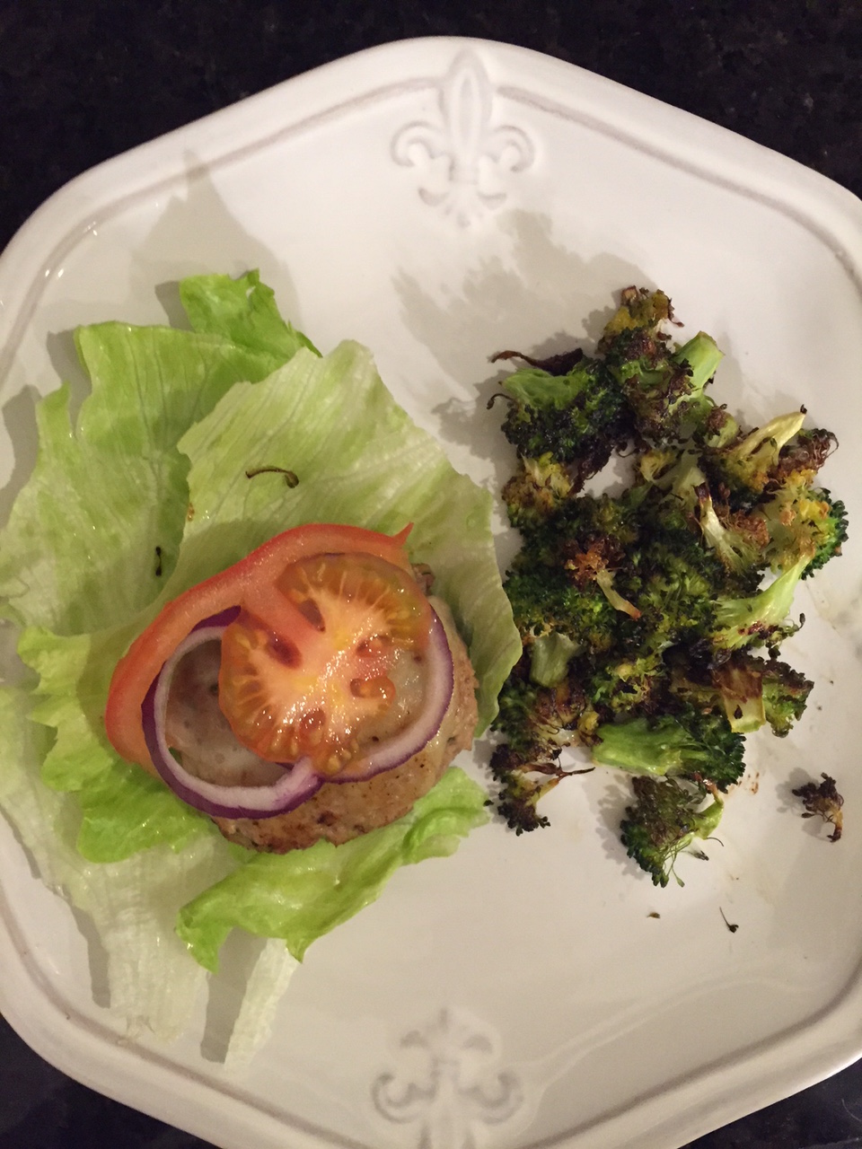 I made Skinnytaste’s turkey and zucchini burgers last week and I really liked them. They are very moist and flavorful unlike some other recipes I have tried. I have made the bruschetta version a couple times and really loved those so I really looked forward to trying them with the condiments of a more traditional burger (no bun, though.) These don’t look like much but they were great and even Madeline loved them. She actually went crazy over them! I served our burgers with roasted broccoli.