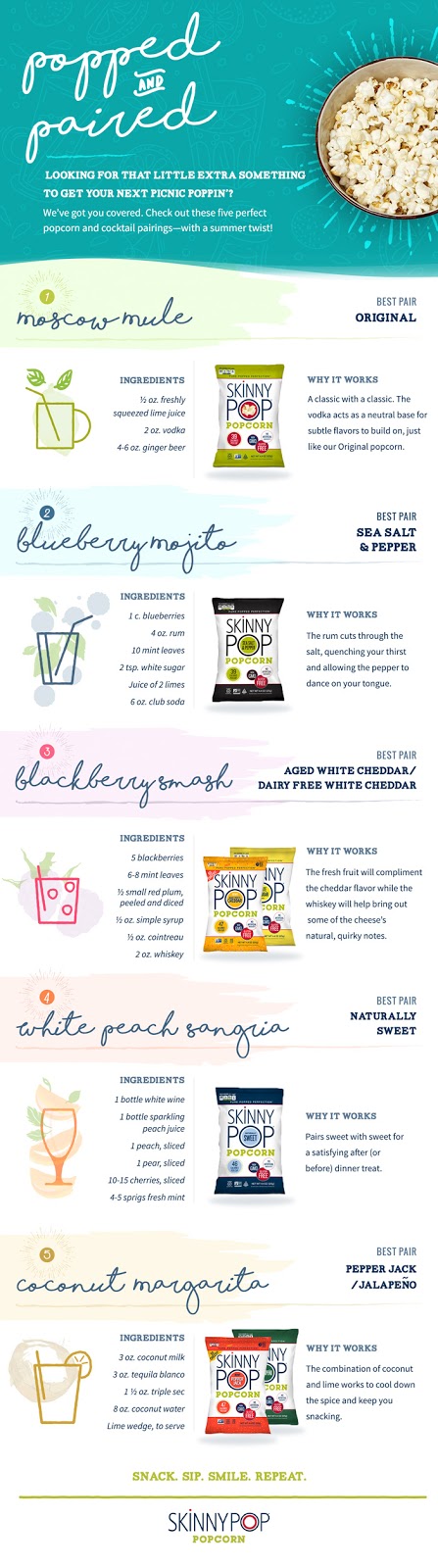 I don’t know about you, but I often enjoy a few healthy snacks to go along with my cocktail. SkinnyPop is one of my favorites and I am a big fan of the original flavor but there are so many to choose from. SkinnyPop recently shared their own list of fun summer cocktails. I have my eye on the blueberry mojito or sangria to try for my next lightened-up adult beverage.