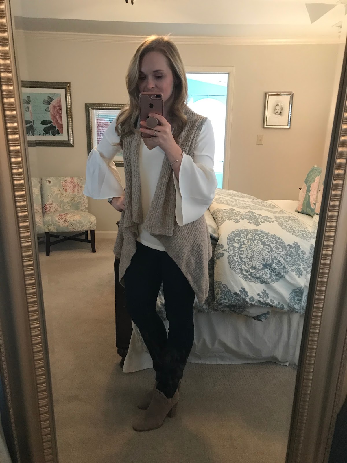 On Saturday, I went to a friend’s baby shower. It was a fun time. It’s been rainy in Charlotte for a couple days (and looks like it will be gloomy for days to come) so I wore this easy outfit. I shared in on Instagram and asked if anyone else’s husband insists that bell sleeves make them look like a court jester? Corey makes fun every time I wear them.