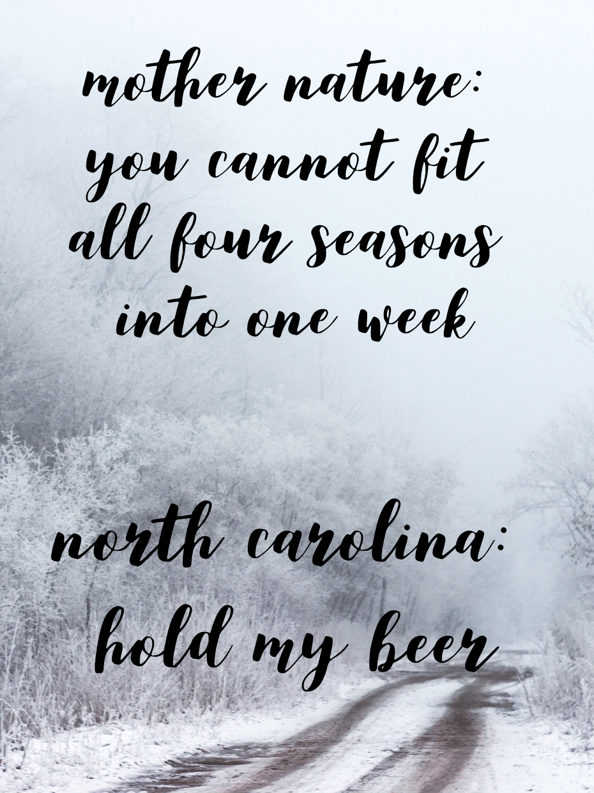 The weather in North Carolina has been insane this week. It was colder again the first of the week, snowed on Wednesday, was super windy yesterday morning, then the day ended with nice, warm, sunny weather.