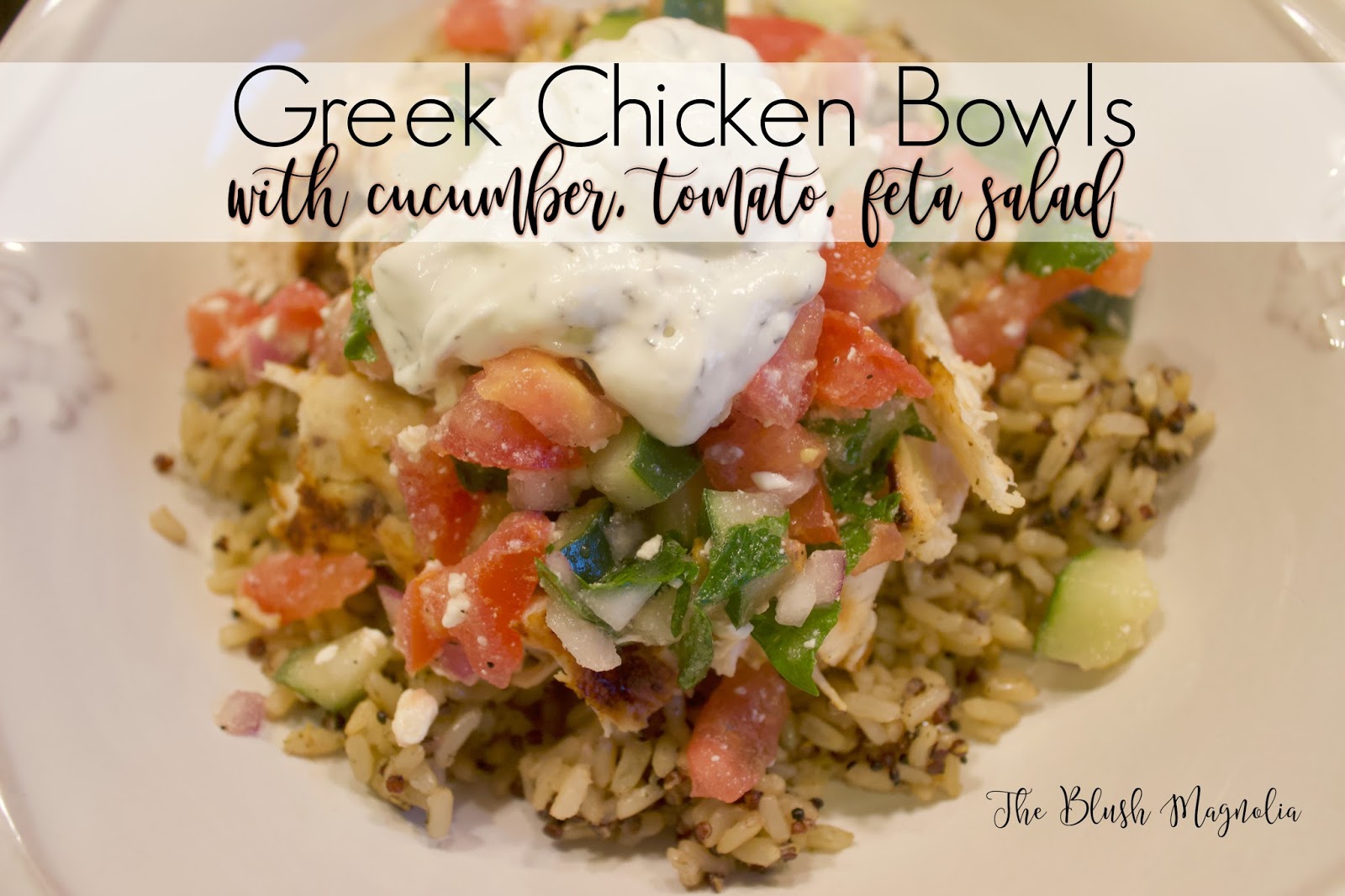 Heat a grill pan to medium-high heat and grill chicken until cooked through and no longer pink then chop. Meanwhile, cook rice and quinoa mixture (I use the 90 second bags with no shame) and serve 1/4 cup in the bottom of each bowl. Top with chicken and the cucumber tomato salad mixture. Serve a dab of tzatziki on top and a few kalamatas if you like them.