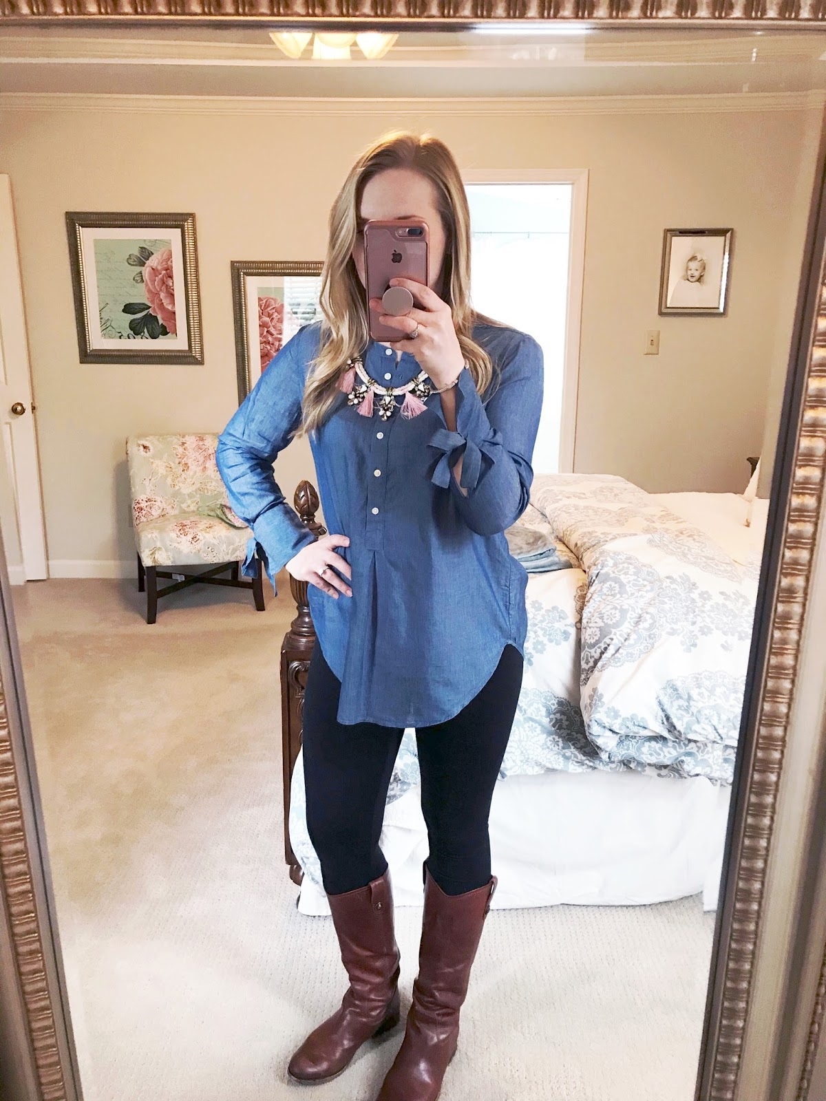 I picked up this chambray tunic in a half off sale a couple weeks ago. It is generous so I went with a petite size and it still covers my booty. I think it would be perfect for spring or early fall with white jeans and booties or flats but it worked really well here with my favorite leggings, too.