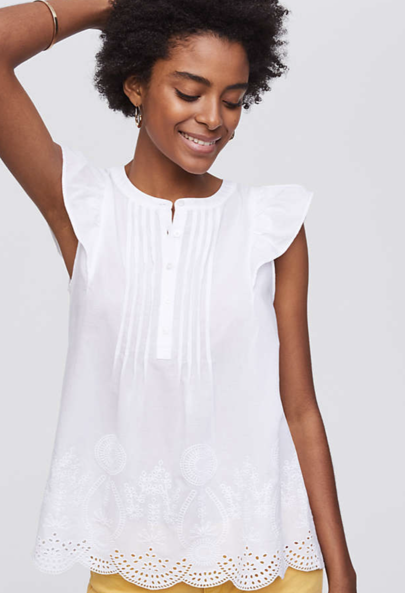 I love this eyelet top. I just love a white top in the spring and summer. You can pair it with anything – denim, white denim with statement jewelry, chambray shorts, bright, fun shorts. A white top really is so versatile and I love the eyelet detail on this one.