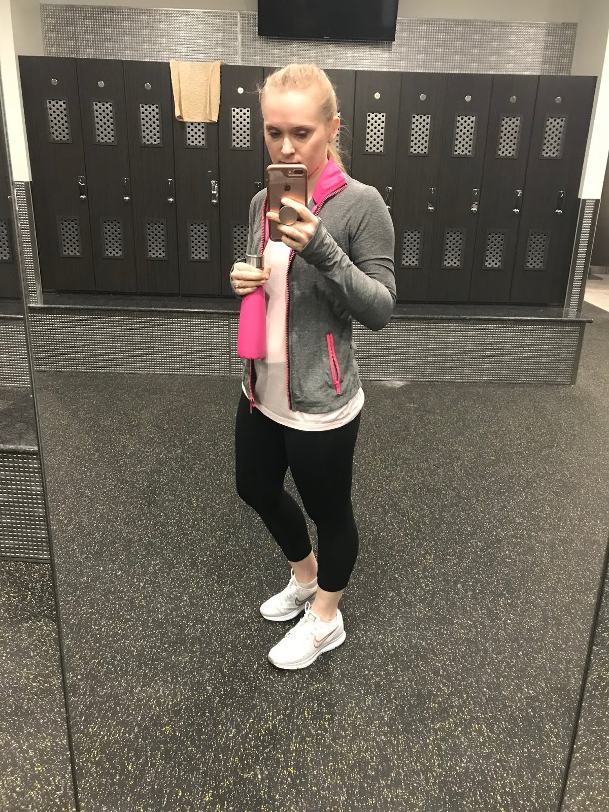 Most days I shower right after working out if I can and Madeline plays with her toys and looks at her books. If we have errands to run I don’t mind running them in workout clothes, I just feel better and more productive if I can shower, do my makeup, and really get dressed.