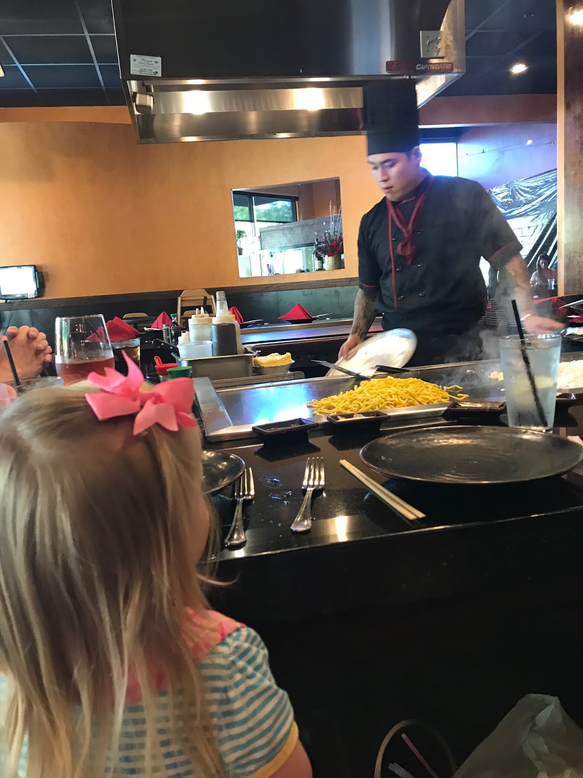 Madeline also had a very busy week last week. She had a play date at the splash pad with one of her favorite little friends and then my parents took her out to dinner to experience her first meal at a Hibachi restaurant. She was in absolute heaven! She loved watching the food cooked in front of her (except for the fire) and went to town on the soup, noodles, chicken, and rice. It was pretty adorable!
