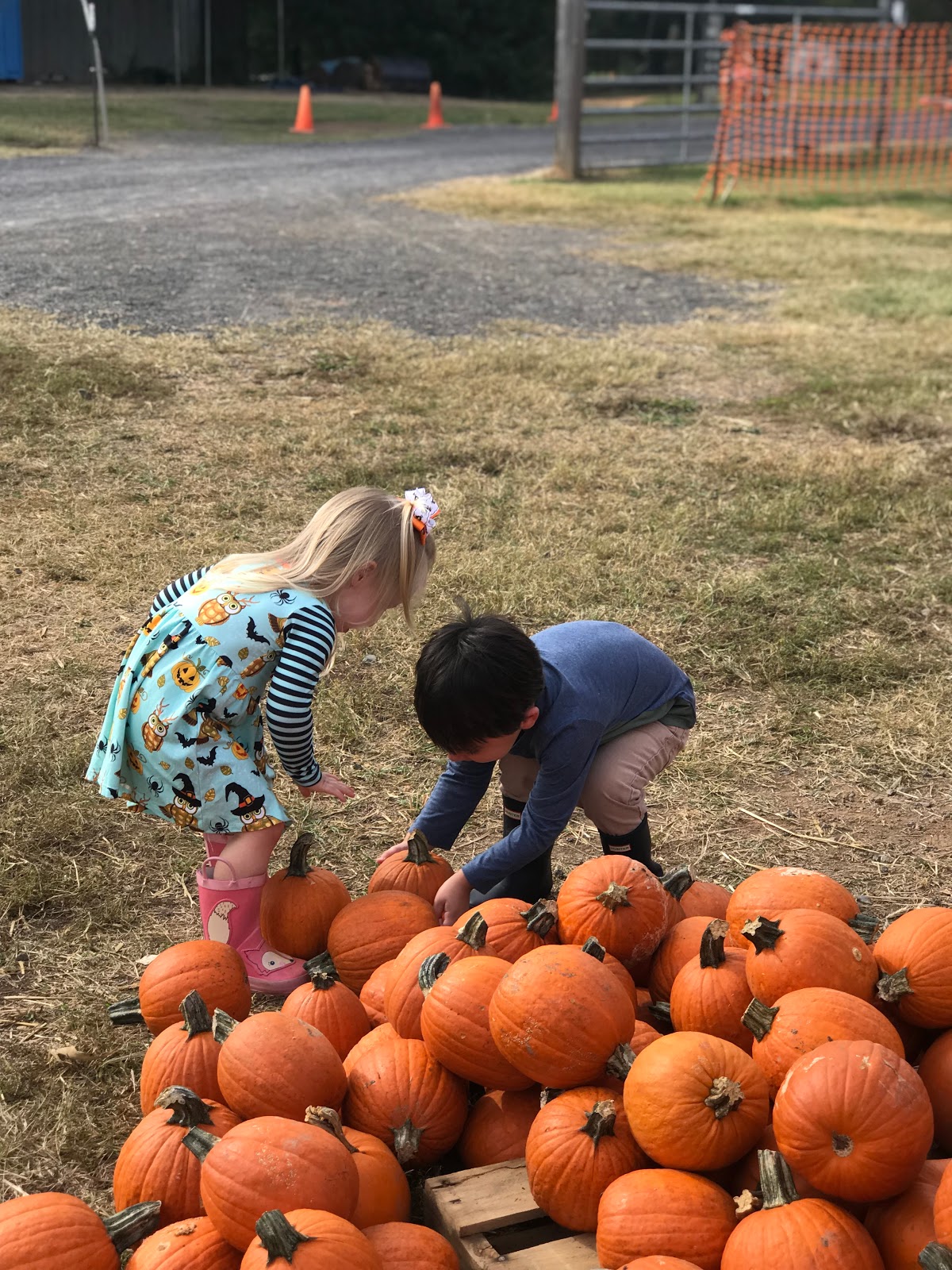 Last week, Madeline and I met up with friends for a visit to the pumpkin patch. It had looked like it was going to rain all day and did sprinkle a bit during nap time but we all put on our rain boots and went anyway and everyone ended up having a great time. There were only a few other people there so our little ones virtually had the whole patch to themselves. What a treat!