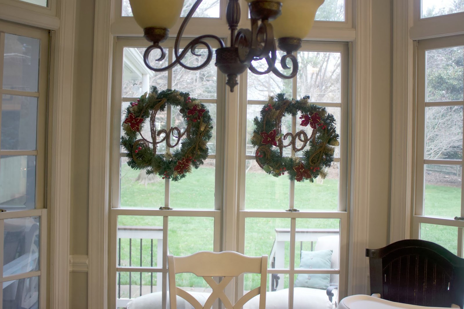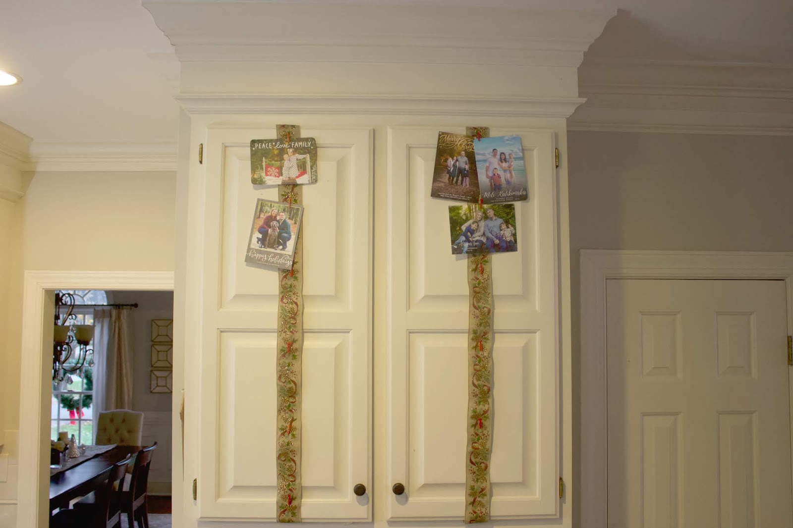 In our little breakfast nook, I hang simple wreathes on the windows. It just adds a little something, I think. Opposite the table is my desk and I hang Christmas cards we receive on the ribbon with tiny little clothes pins.