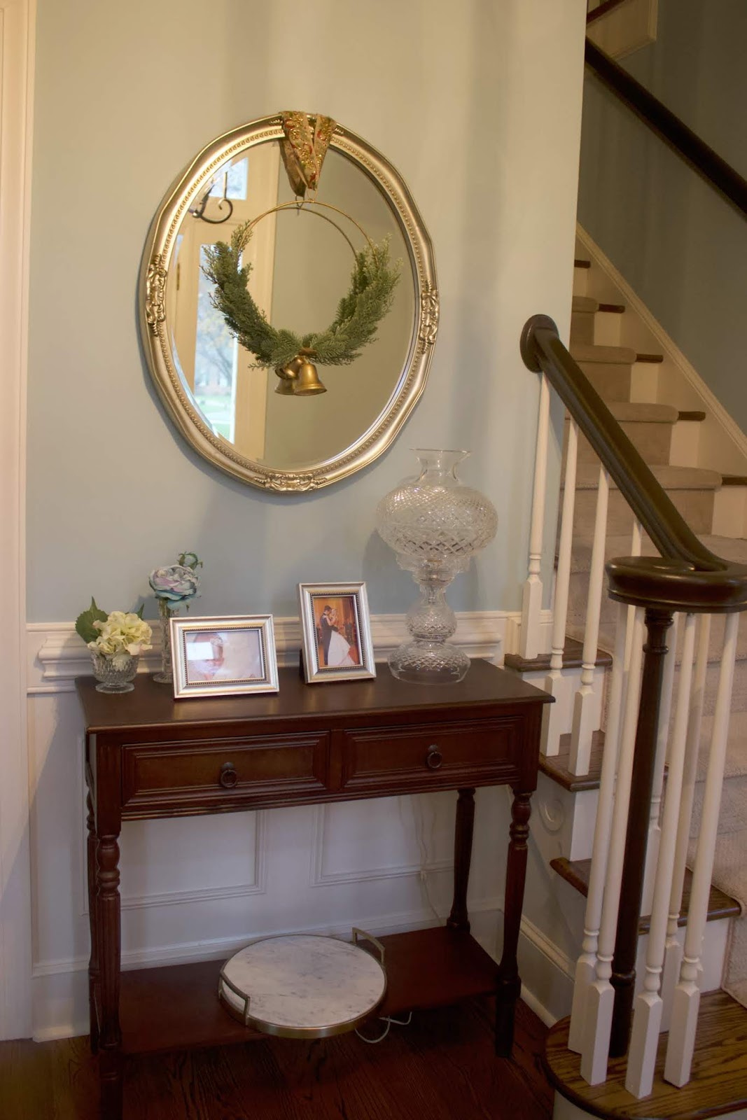 Let’s step inside. I just hung a wreath (from last year’s Hearth and Hand collection at Target from our foyer mirror. Last year I set up my little Christmas village on the console table but it just didn’t happen this year. I totally forgot to get it out and then didn’t feel like climbing back into our dormer storage at a million weeks pregnant.