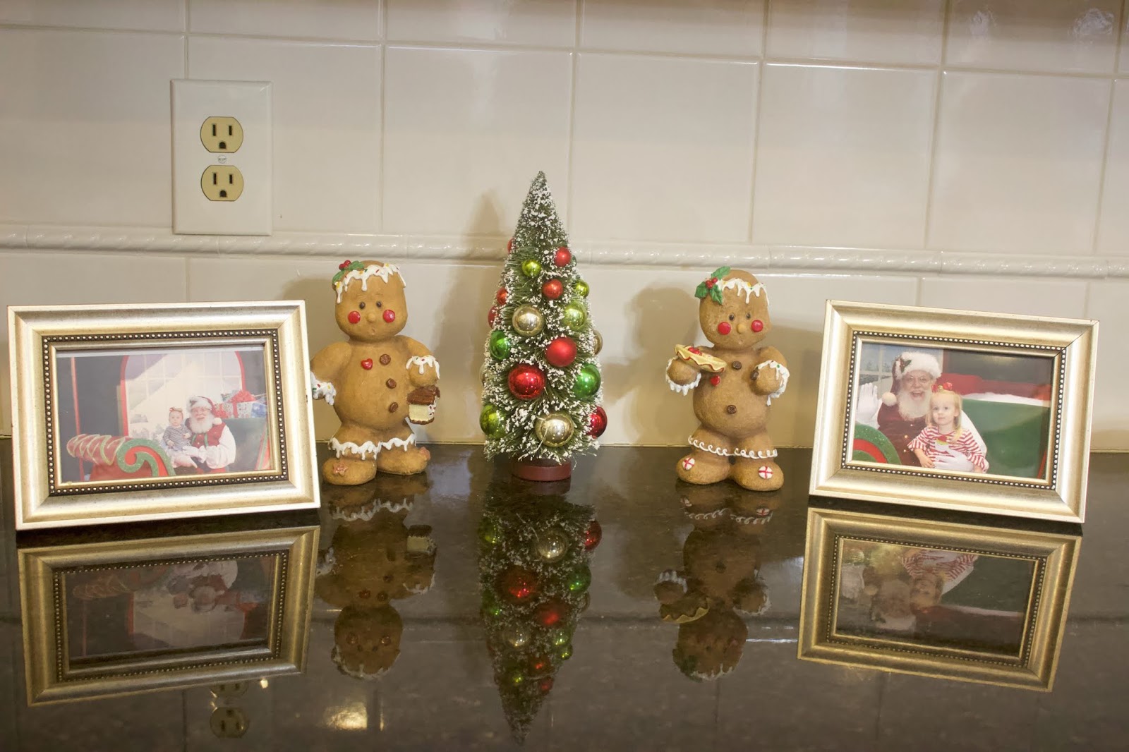 I just add a few decorations to the countertop in the kitchen and am displaying a couple of Madeline’s Santa pictures. Getting these out every year is so fun.